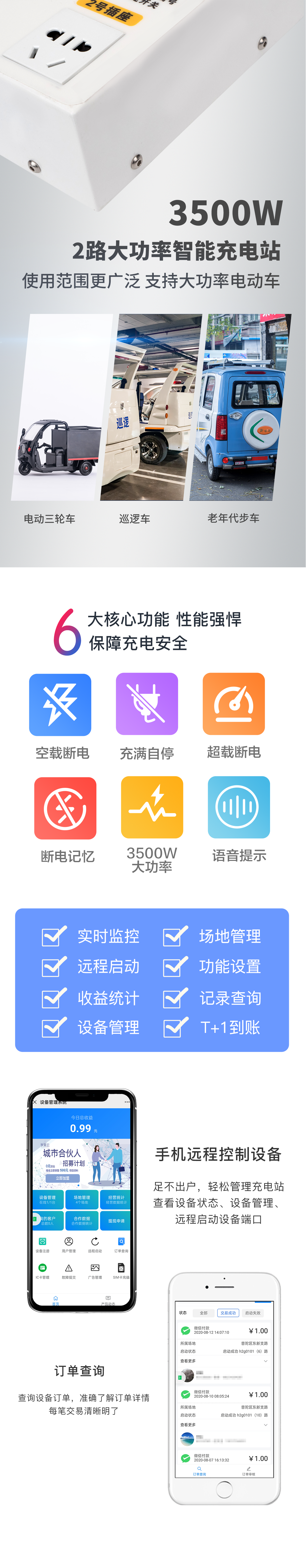 實時監測 | 遠程啟動 | 收益統計 | 設備管理 | 場地管理 | 功能設置 | 記錄查詢 | T+1 到賬